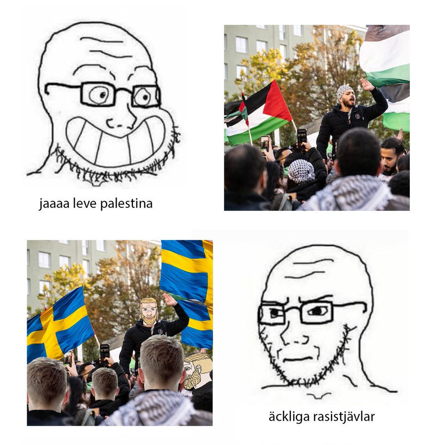 >>217211469Stödjer inte övre bilden, stödjer nedre bilden. Stödjer Palestina, stödjer inte Israel. Stödjer inte rasism, stödjer inte mångkultur.
