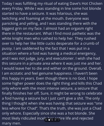 >>217235388En incel spyr ut hat. Han representerar inte alla incels. De som håller med honom är vidriga så är det.Finns tjejer som gör videos som är extremt obehagliga och hatiska mot män, förmodligen sånt han har kollat på för att hetsa upp sig och spär på sitt hat mot kvinnor.