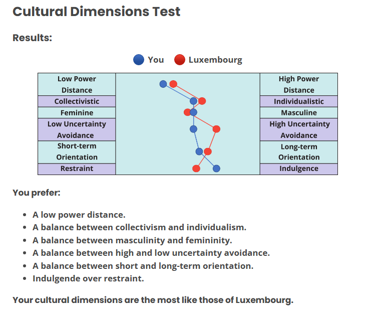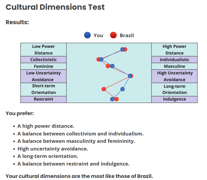 Which country do you have the most similar cultural dimensions to, /int/? For me it's Brazil.
