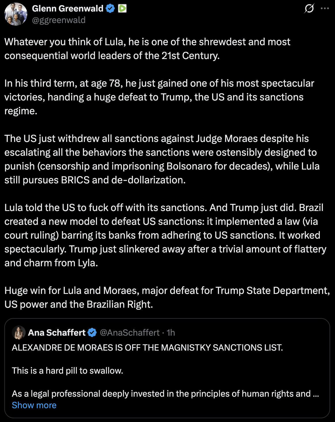 >>217549851Estes gringos consomem suco de laranja, comprar armas taurus, café e carne brasileira adoidada você realmente achava que o tarifaço de 50% iria durar?