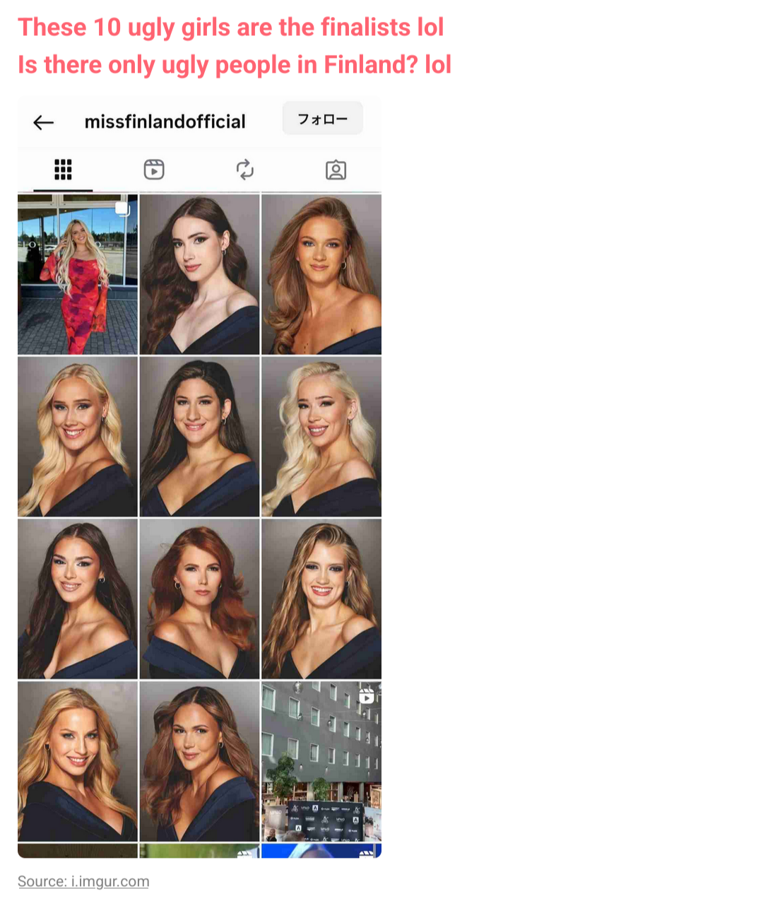 finnish people are quite ugly on average, but unlike japan and korea where gravure and AV actresses are popular millionaires, in most of the west, these aren't lucrative careers and no one cares about "miss finland". last time i heard about this competition was 5 years ago when they chose a somali as winner.