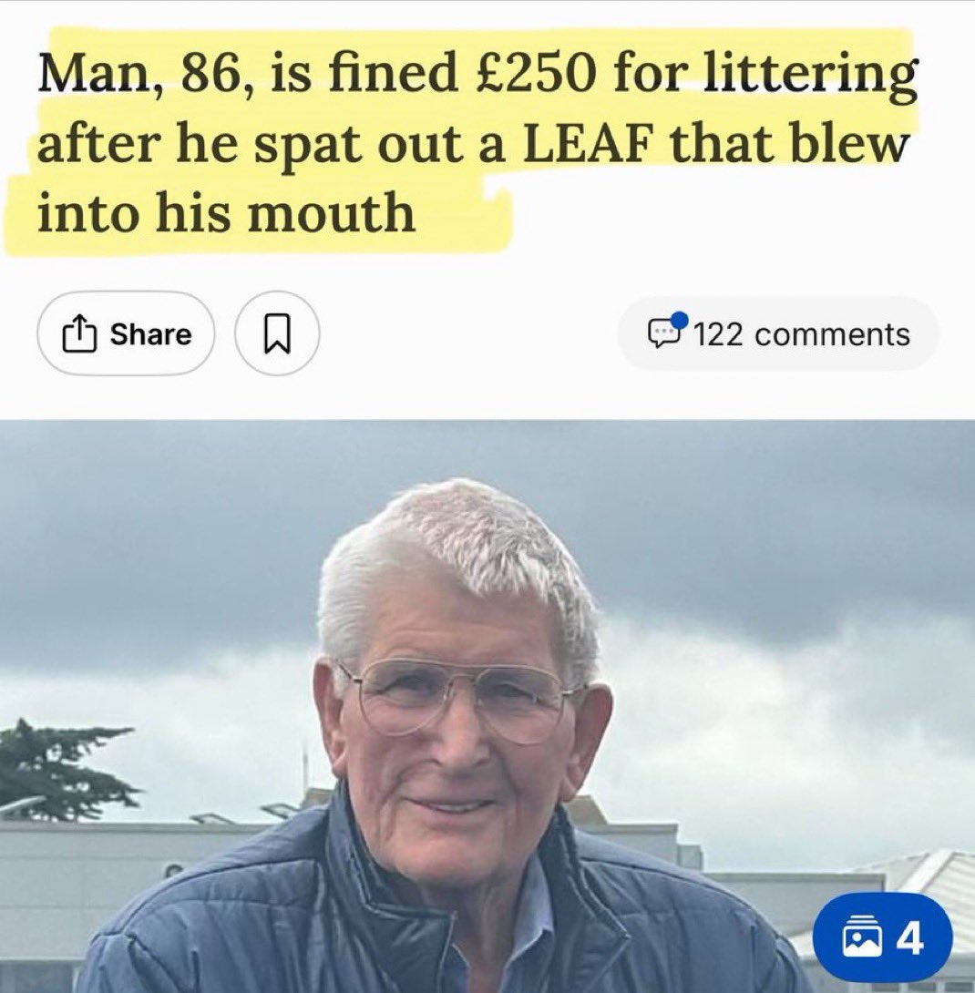 A British pensioner with stage 3 cancer and severe asthma has been fined £250 for littering after spitting out a leaf which blew into his mouth.Roy Marsh, 86, was resting in a car park in Skegness, Lincolnshire, when he was hit with the fine.He had been on a stroll in South Parade car park when a stray leaf blew into his mouth. He spat it out, and then two men from the litter police approached him. They told him they witnessed him spitting onto the floor and fined him.He was issued with a fine of £250 – later reduced to £150 after an appeal – which he paid.vat a country!!