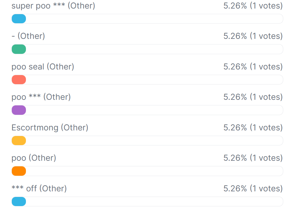 We have 7 votes for the Gherkin and 6 votes for Poo Seal.It's a very tight race at the top for first place.Other minor contenders include poo, black pussy CHANGED rorke and um.Make sure to get your vote in before 9pm via Strawpoll.