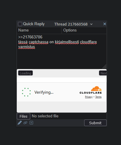 typerä vika tässä uudessa kaptsassa en pysty postaamaan jos kaptsan tila on erification not required tulee no valid kaptsa vikaviesti. eli en pysty vstaan ku kerran tunnissa suunnilleen