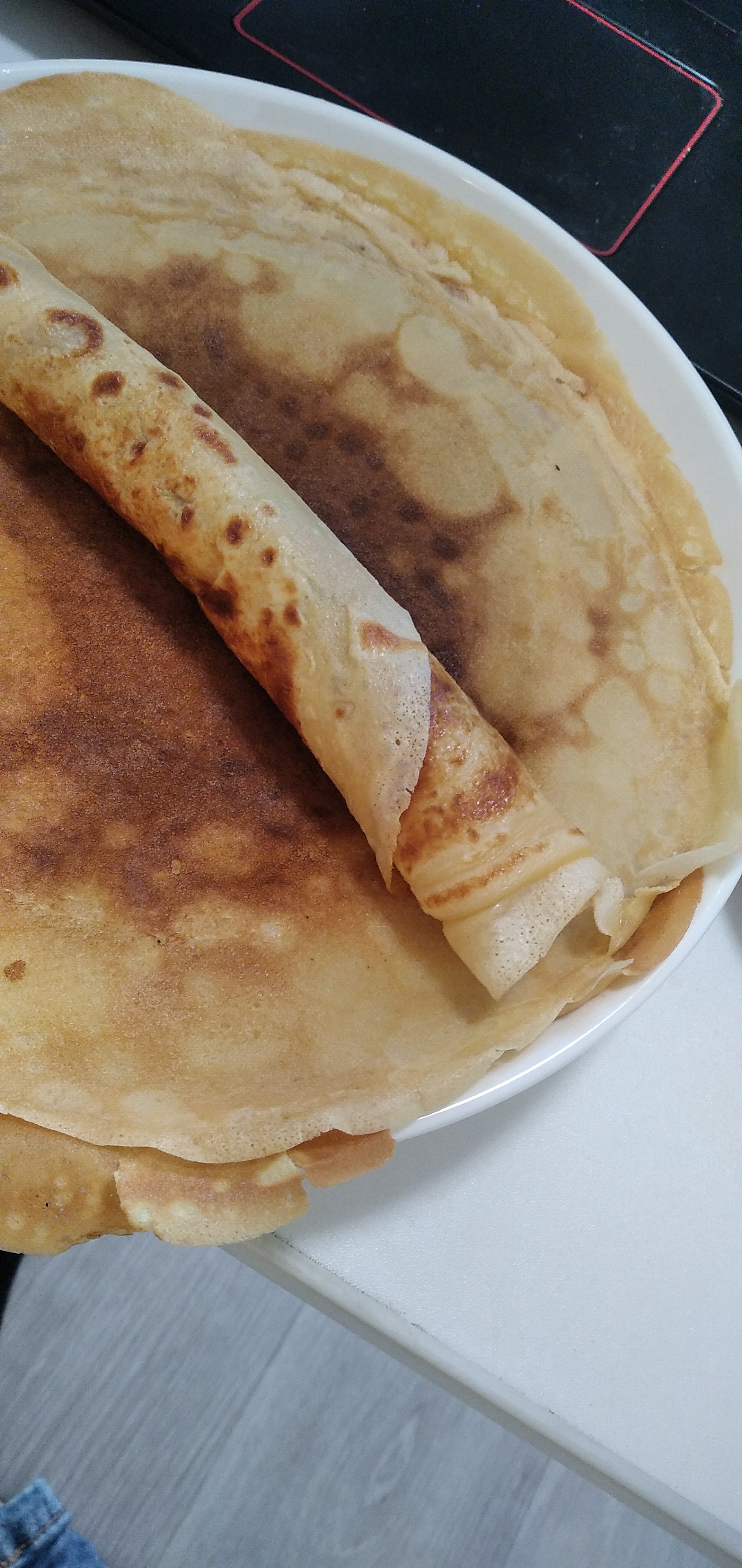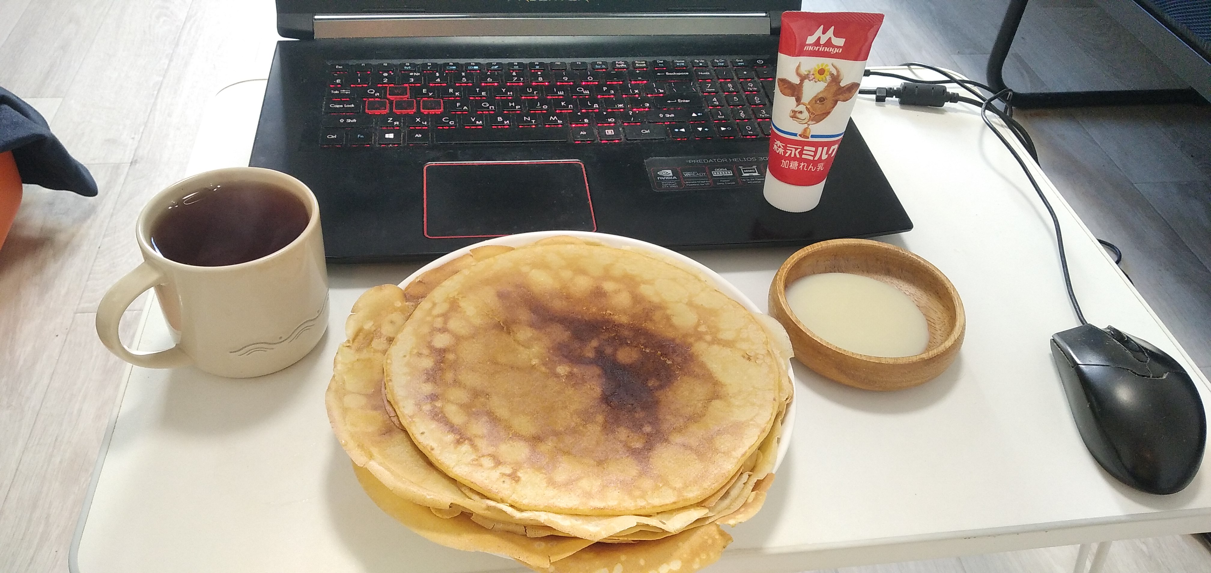 Having blini with condensed milk for breakfast. This is my favorite thing to have for breakfast. Drinking tea, it's Darjeeling which I found at work with pine needles which I bought for money. After I finish the breakfast I'll go for a walk. How about you?