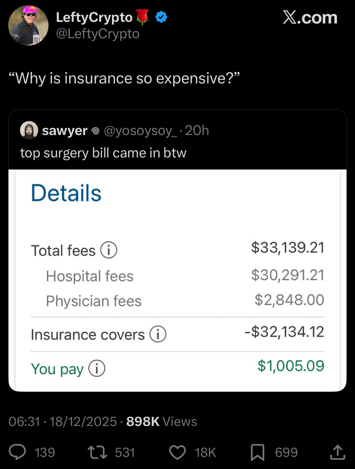Are you brainlets aware that insurance covers almost all of that and they paid $1k>Yeah but what if-Insurance covers it, if the tranny had to pay it fully they can go to Thailand or whatever