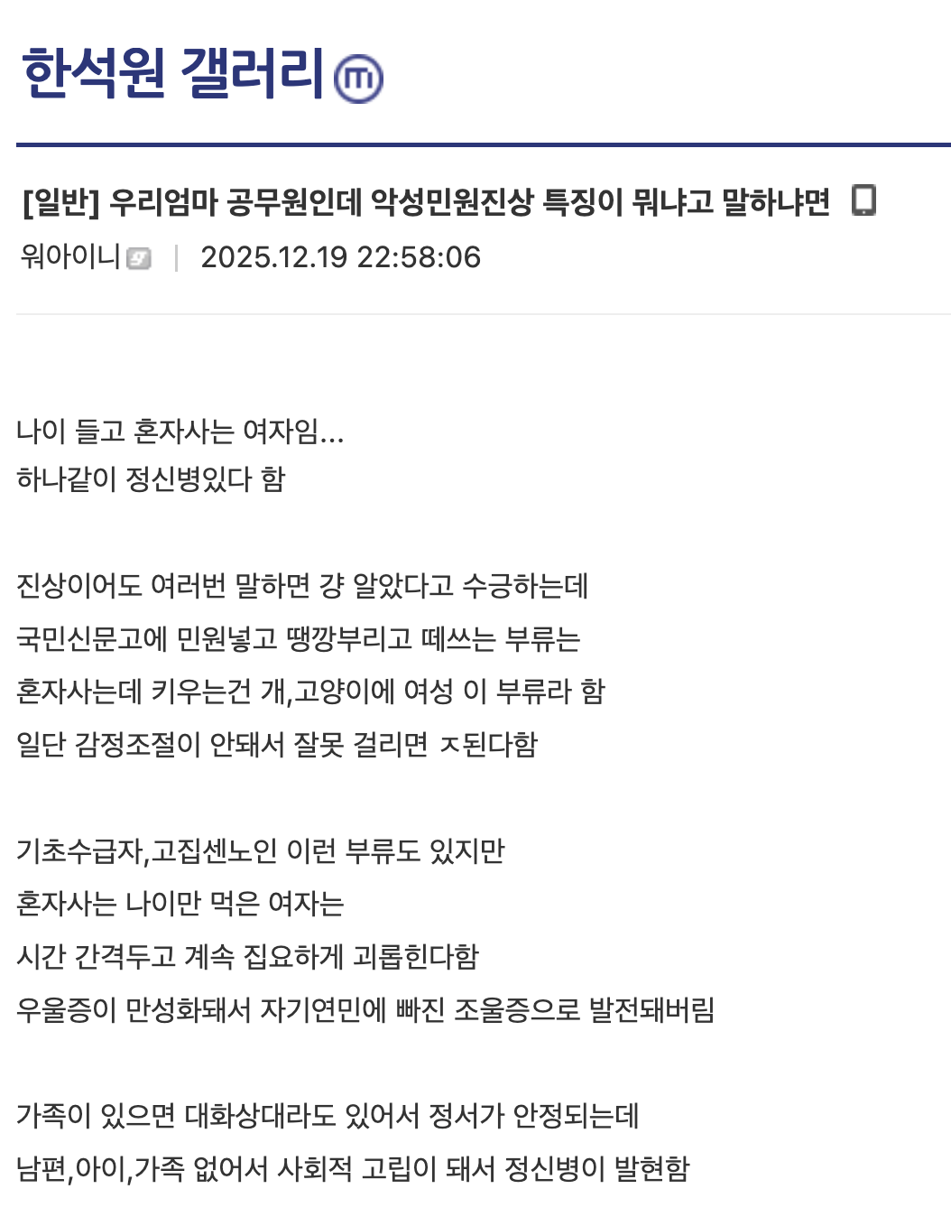 >>217730545ㅋㅋ 씨발 유학할 때 홈스테이 호스트가 딱 이 케이스였다. 60 쳐먹은 년이 맨날 쳐울고 나한테 시비 걸고 개지랄하는데 나까지 정신 나갈 거 같더라