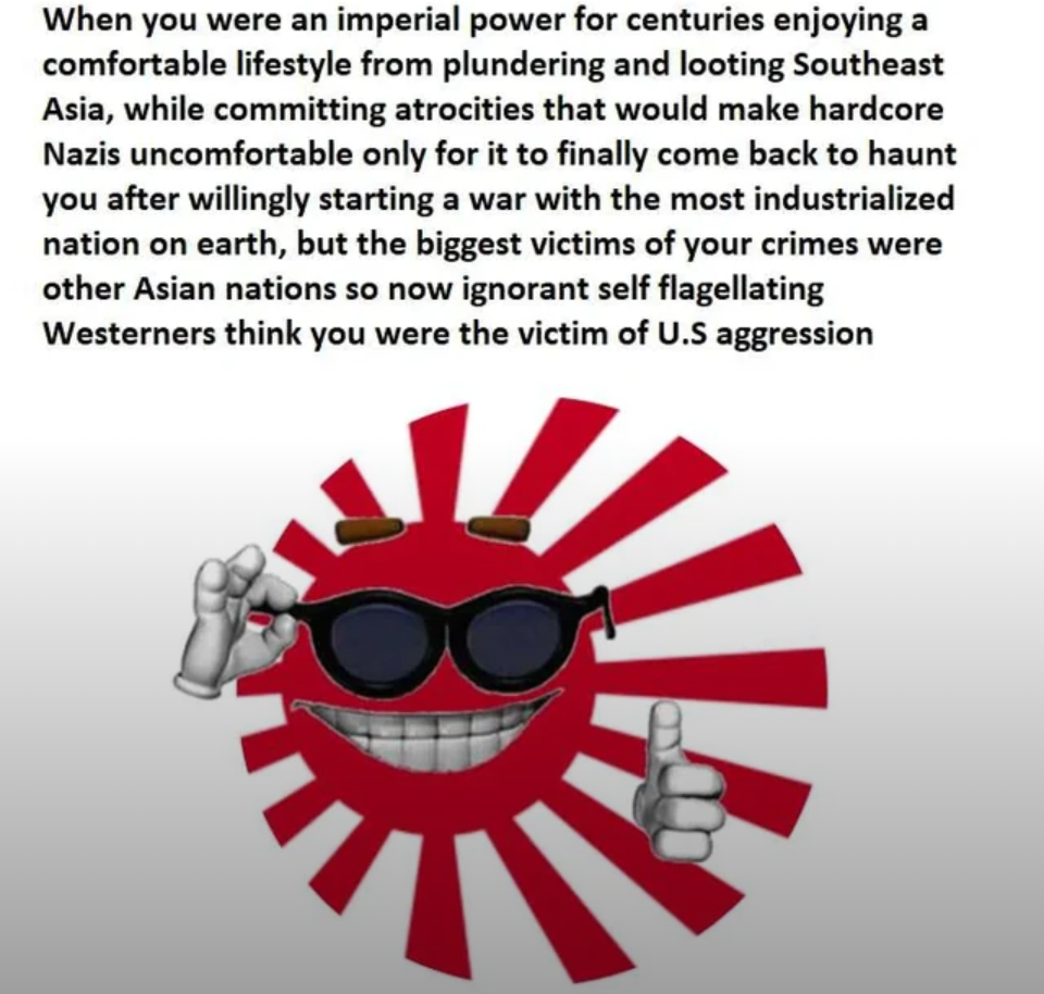 >>217758315You sound defensive and mad.>>217758483This. He makes it look comfy.>>217758411When has he ever criticized Japan for invading Korea, China or the Philippines. Which film was that again?