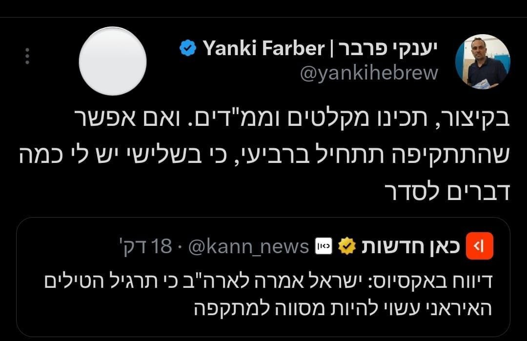 >העיתונאי ומפקד בכיר בצה"ל לשעבר יענקי פרבר מבהיל: תכינו מקלטיםמוכנים?לדעתי מחר בלילה או מחרתייםאו עוד שעה ב3 כמו שעשינו להם