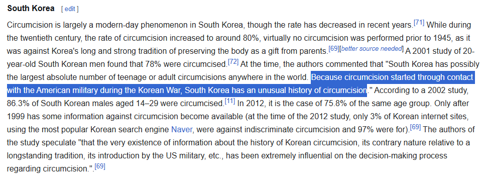 >>217791312In the Korean War, korean women saw so many American penis they started to demand circumcision from their own men