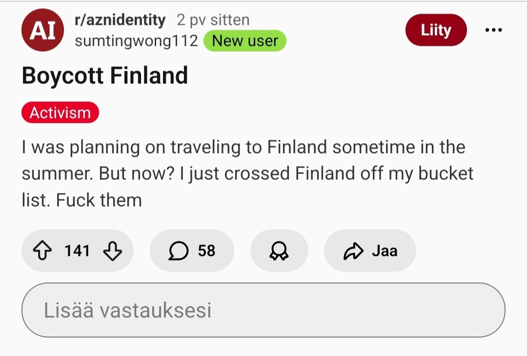 >>217797131> aznmasculinity and aznidentity seething upon finlandOh god i now love finland so much not even joking. Thank you finland for pissing them off. Please be more racist towards us. Thank you