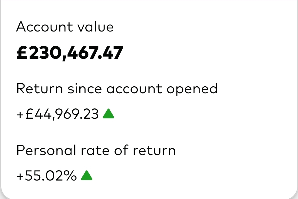 >>217807242cba to screenshot but:Account Value: £81978.07Return:+£19.900.50Personal rate of return (don't really get this number 2bh):+107.08%