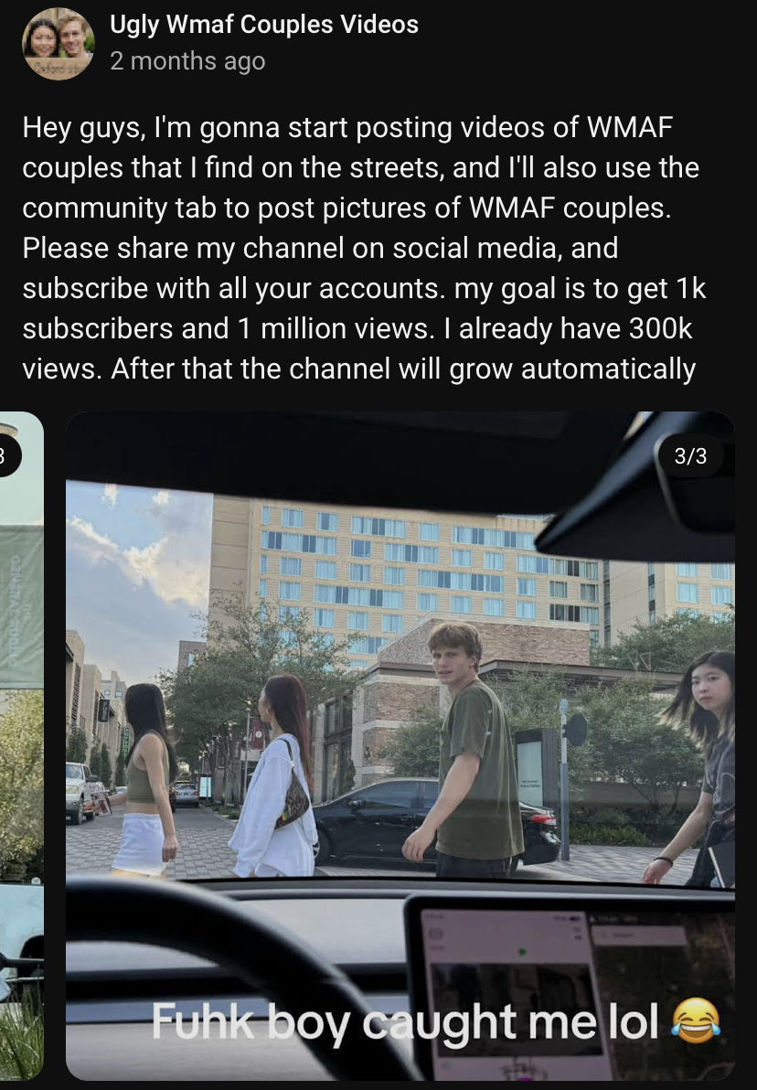 >Hey guys I'm gonna start posting videos of WMAF couples I see on the street why does zhang do this?