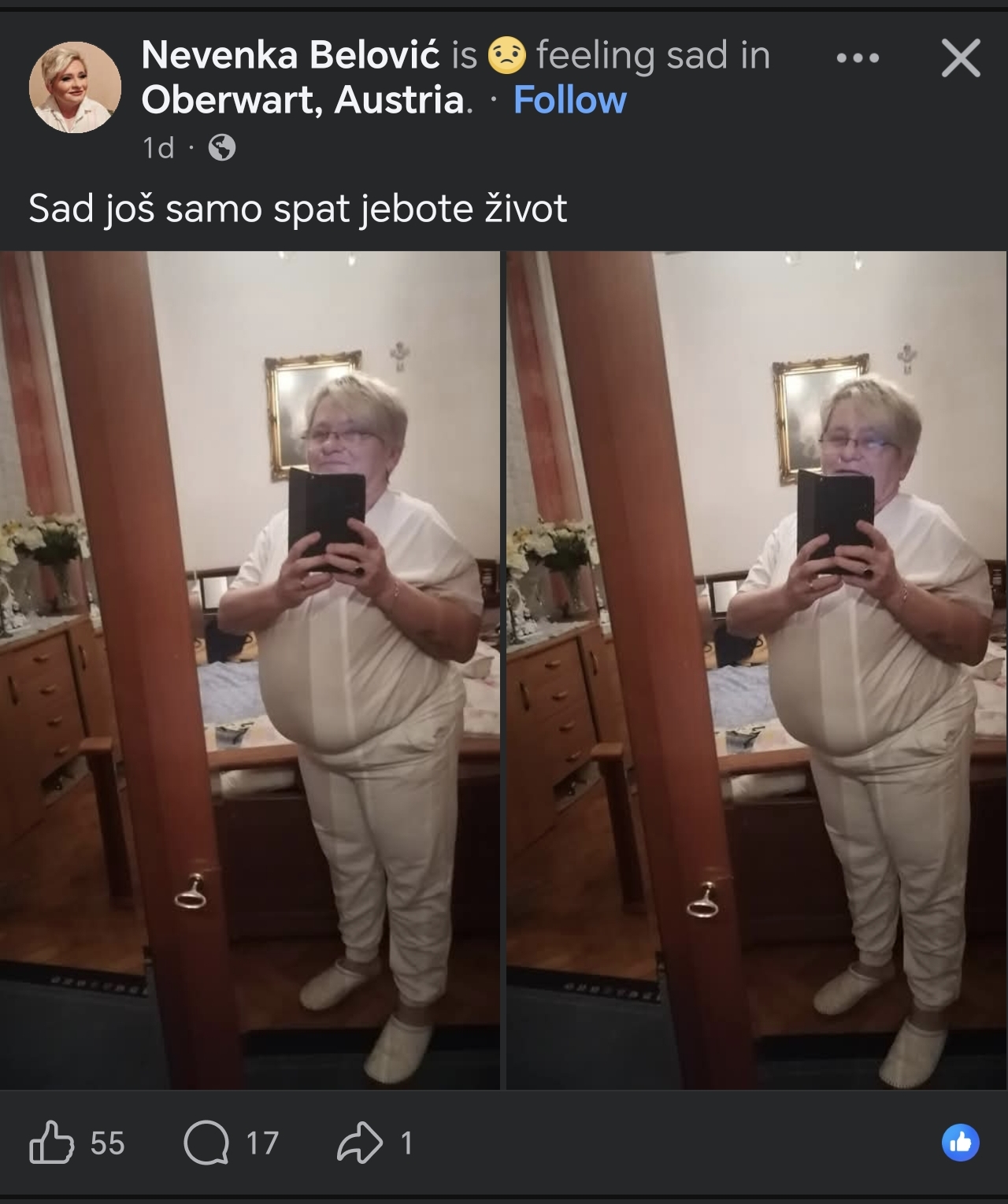 Dobro mu je u Sloveniji i nijedan Srbin ne zeli ici nazad iako se imaju svi za Srbe i svi vole Srbiju. Oni zele srpsku Sloveniju. Svi mi to toleriramo jer smo Slovenci previse tolerantni. Ali mislim, da duze sto traje ta srbifikacija Slovenije, lose ce biti. Jednog dana ce nekome dopizditi i opet ce nas svi zvati da smo rasisti i neznam sta jos.