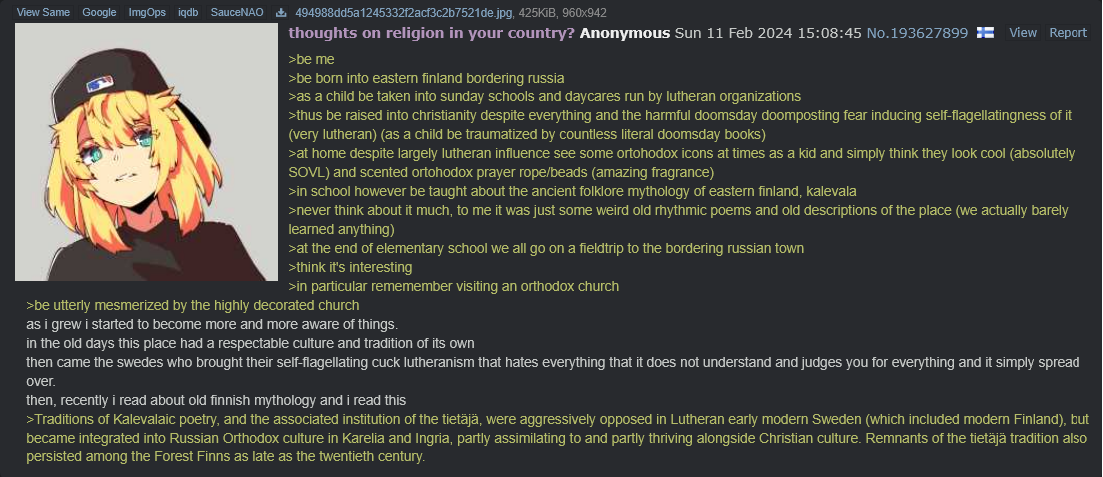 >>217837995Well that's not wrong. Kat is from a family with some Russian Orthodox influence at home, who had a spiritual Russian homosexual euphoric moment on a trip to Russia which further solidified his hatred of Finland and it's culture.The middle one is, despite the Nazi larp an aspiring pro-Russian far-left politician who seeks to make Finland Russian Again.Buttboi Vlad is simply a Russian and hates Finns.see: https://desuarchive.org/int/thread/210197784/#210198474