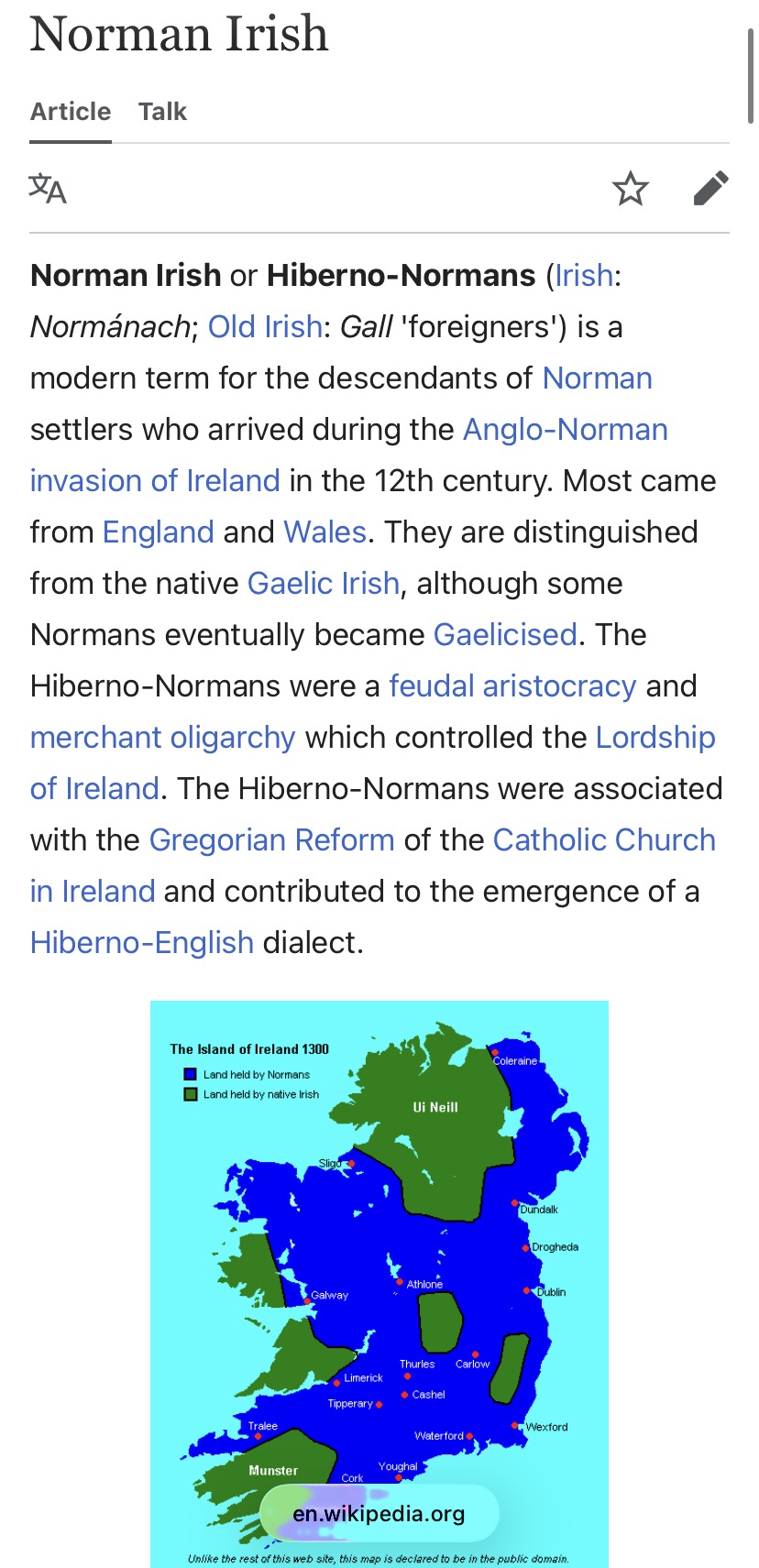 >>217850469Vast majority of Irish people have Anglo-Norman ancestors, >the Normans in Ireland (Irish: Gaill meaning "foreigners") were at times indistinguishable from the surrounding Gaelic lords and chieftains. Dynasties such as the Fitzgeralds, Butlers, Burkes, and Wall clans adopted the native language, legal system, and other customs such as fostering and intermarriage with the Gaelic Irish and the patronage of Irish poetry and music. Such people became regarded as "more Irish than the Irish themselves" as a result of this process (see also History of Ireland (1169–1536)).