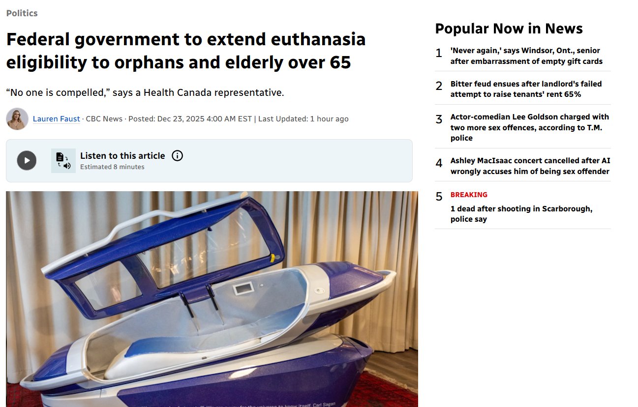 >>217853680Why are you using a shooped image? I can't find such article on CBC, and the suicide pod is a dead giveaway since that's a Swiss technology for most efficient suicide, and no such efficiency is allowed in Canada's healthcare system, it needs hours of unnecessary labour hours by doctors and nurses billed to the health system.