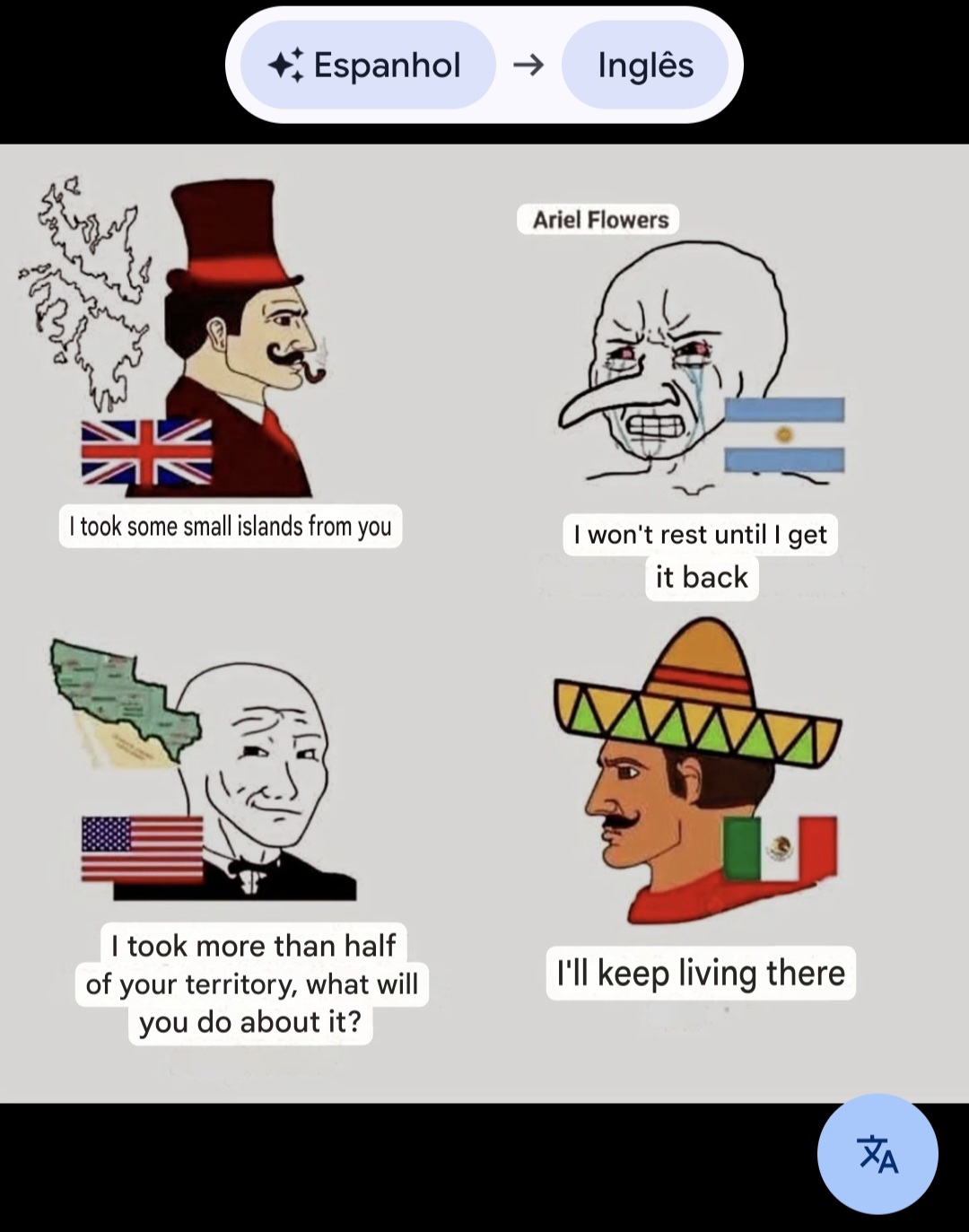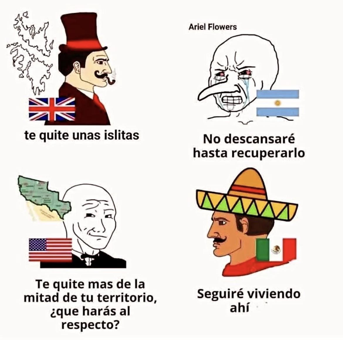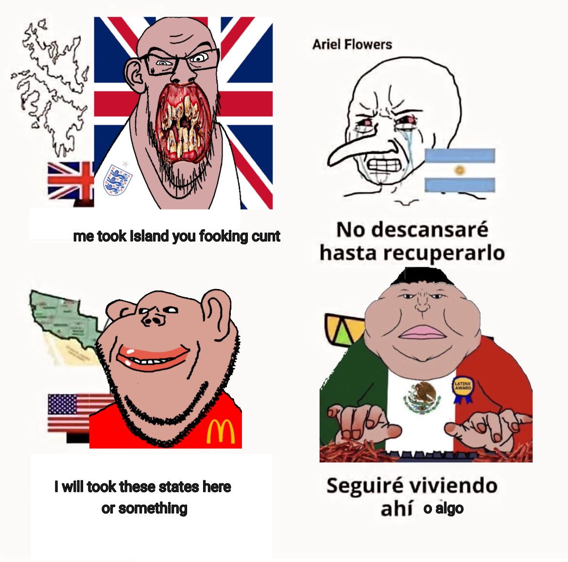 >>217856904UK: Get off our islandsArgie: We will never recover from thisUS: Get off our land, why won't you respect borders?Mex: We will live here.[spoiler] I cannot speak spanish [/spoiler]