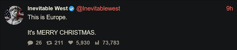 >>217877073Merry Christmas. On a side note, I've always found it funny how in non-Christian countries people have no problem saying Merry Christmas, yet in western Christian countries there are people who are offended by it. Truly neo liberalism/wokeism/cultural Marxism has done significant damage to the west