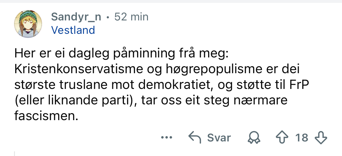 Husker for bare 2-3 år siden så var du rasist og nazi bare du du uttrykte at det var det minste problematisk med innvandrere. Det var liksom å legitimere ekstremisme og konspirasjonsteorier. Nå er de mest oppstemte kommentarene kritiske til innvandring.Litt som at AP nå sier det samme som FrP for 10 år siden selv om de da sa det var rasistisk og nazi.Normissene begynner endelig å skjønne det men de vil aldri unnskylde for å ha kalt folk for rasister for akkurat de samme meningene som de har nå.