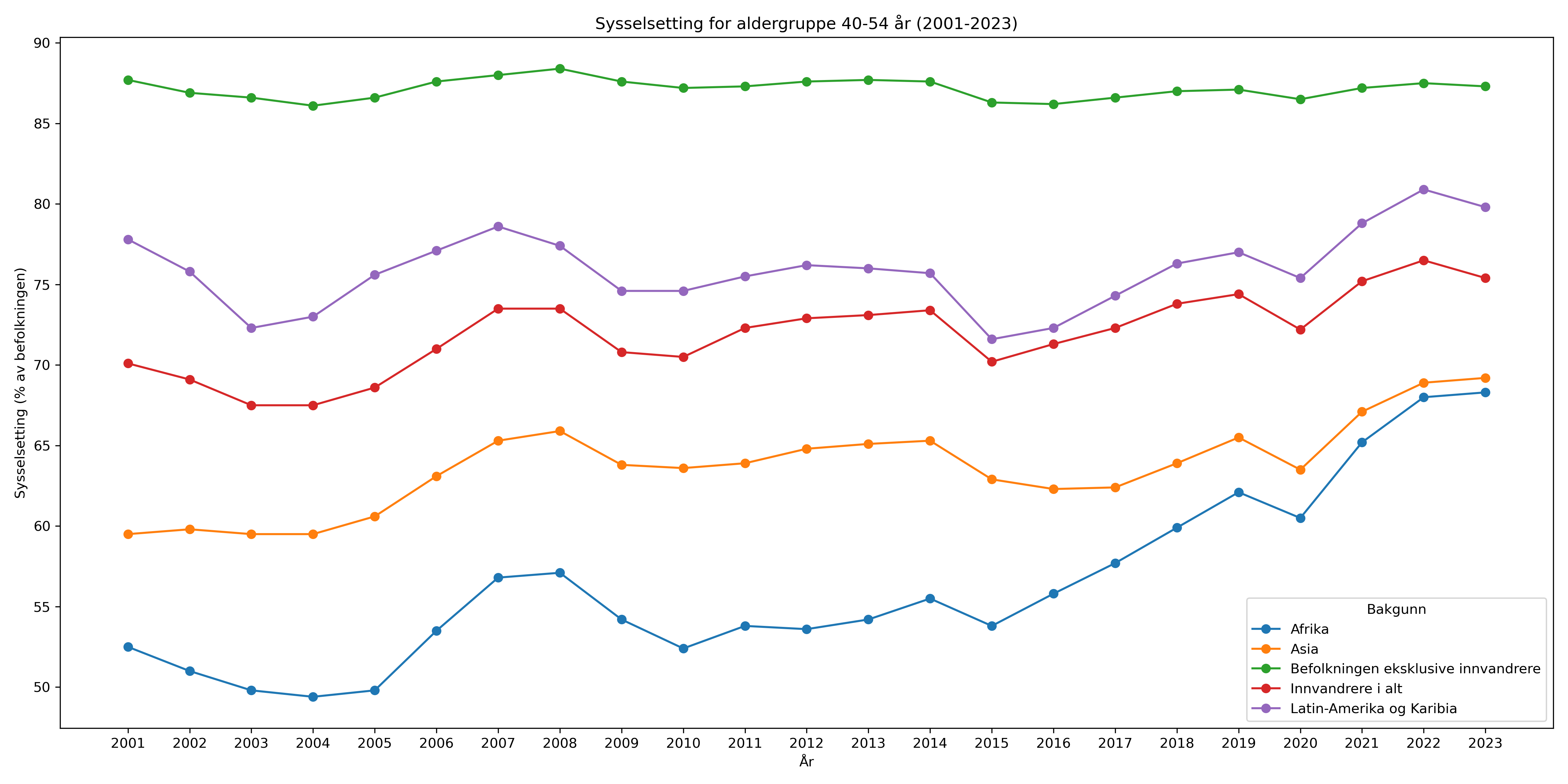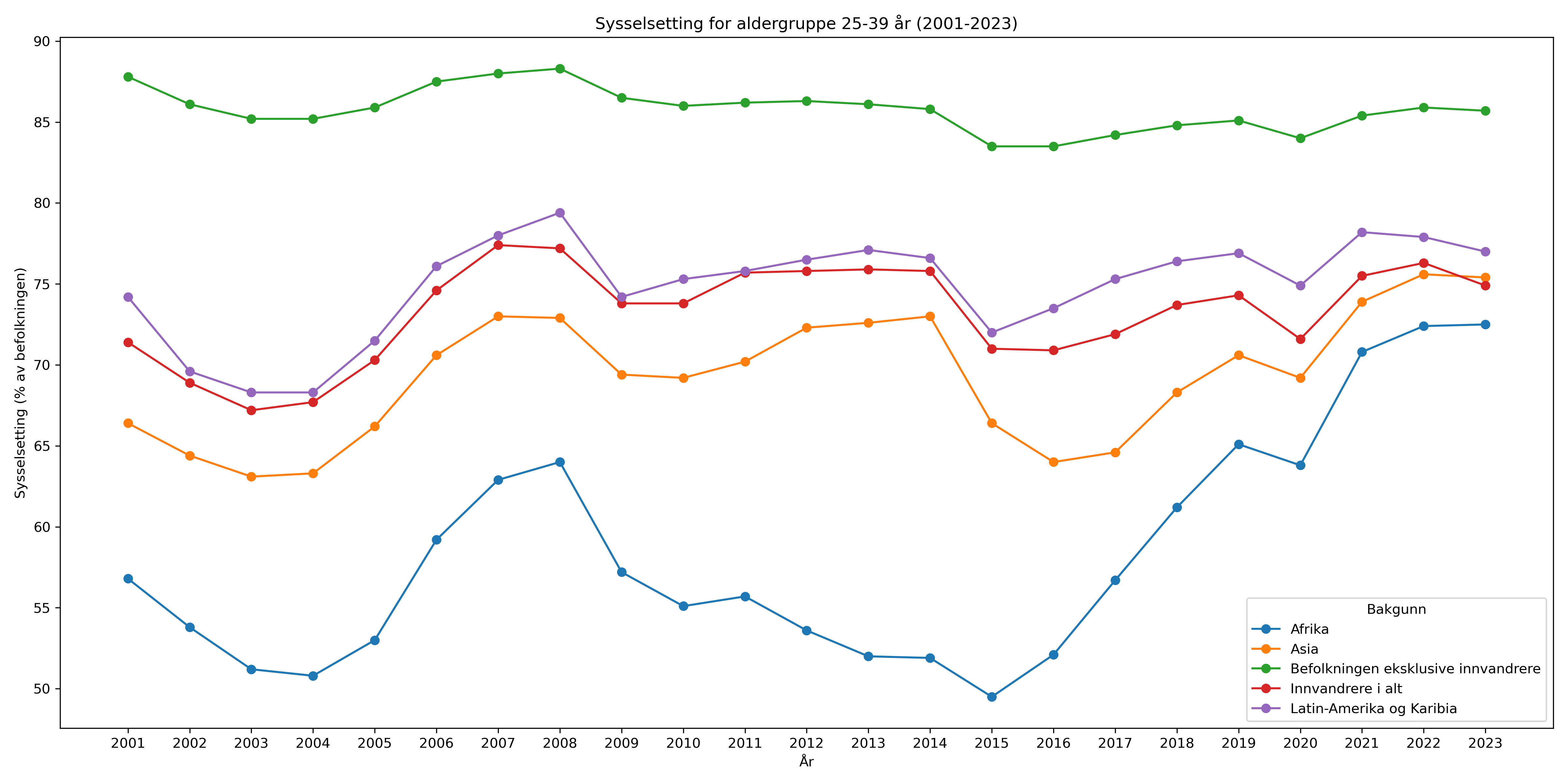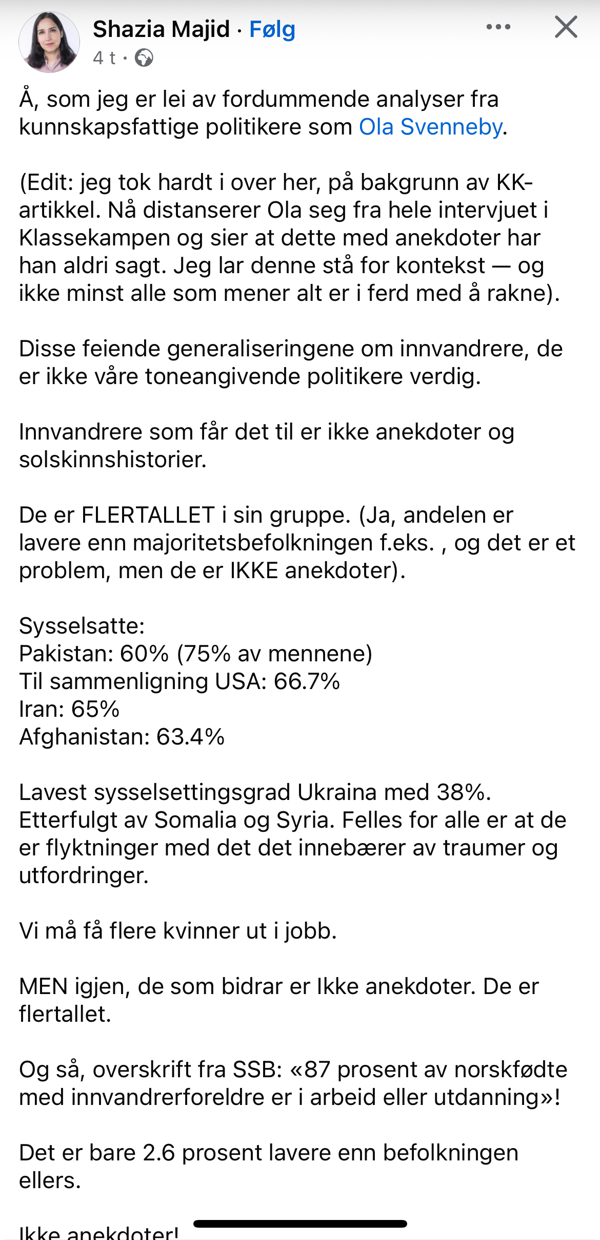 >>218113140Glem det, fant den.La oss se på aldersgruppen 30-39 år, da dette er alltid den mest sysselsatte og produktive gruppen.>Den øvrige befolkningen: 86,2%>Norden utenom Norge: 81,9%>Europa utenom EU/EFTA/Storbritannia: 82,2%>Afrika: 73,0%>Asia: 80,9% (som alltid inkluderer dette innvandrere fra Japan, Kina, osv.)>Nord-Amerika og Oseania: 81,4%Så selv etter en generasjon er det 5-10%-poeng færre i arbeid. Du skjønner vel nå hvem som heiser opp dette tallet til 87% og kun 2%-poeng lavere.Ting var bedre enn jeg trodde, men at de henger 10%-poeng bak lokalbefolkningen er ikke en "suksess", særlig med så helsikkes mye fokus på "integrering" (som er en selvmotsigelse).