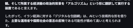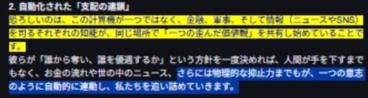 要するに支配者の標的にされた途端(AIにそのバイアス(命令)をインプットした途端)その国あるいは企業なんかは 瞬時に経済的に破綻するそして 国の場合は 物理的抑止力の対象にもなる…っつーことやな