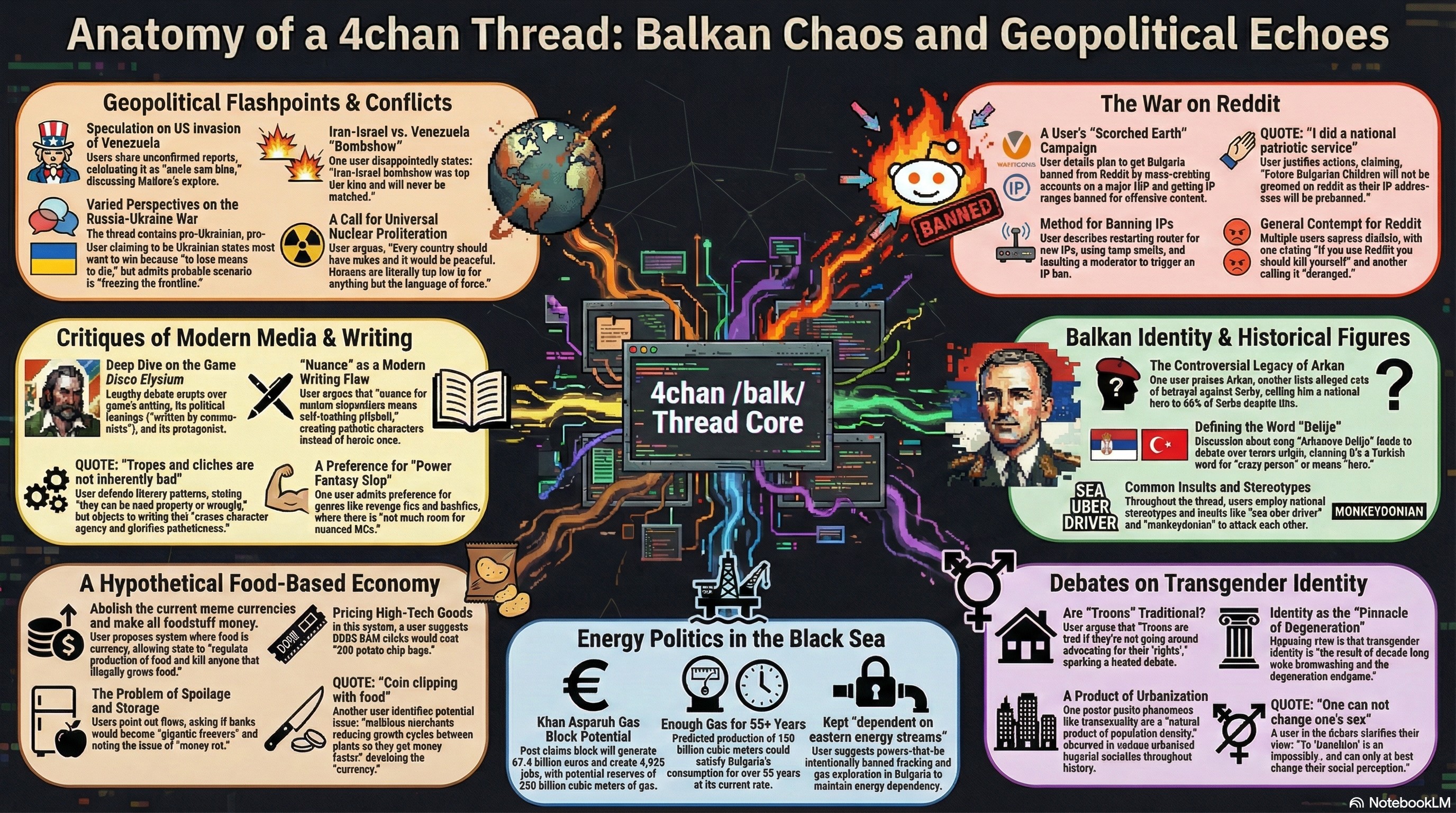 AI overview of last thread:long:https://voca.ro/1dSUJp1bQWSushort:https://voca.ro/18tD3p4FHbZPexperimenting with infographics:https://i.imgur.com/XbFIJ4y.jpegThis archive contains a **4chan thread** from the **International** board, primarily featuring a chaotic discussion between **Balkan users** and a **Ukrainian refugee**. The participants engage in hostile banter regarding **regional geopolitics**, the ongoing **Russian invasion**, and the social impact of **refugees** in countries like Bulgaria and Greece. A significant portion of the dialogue focuses on **digital activism**, including a user’s claim of intentionally getting **Bulgarian IP addresses** banned from **Reddit** to "protect" the country from liberalism. The text also touches on niche topics such as the video game **Disco Elysium**, the ethics of **AI-generated content**, and speculative news about **Venezuela**. Throughout the exchange, the language is characterized by **extreme profanity**, **ethnic slurs**, and a cynical, **anti-establishment sentiment** typical of anonymous imageboards. Overall, the source serves as a raw snapshot of **online dissident culture** and the tension between **nationalist identities** in Eastern Europe.