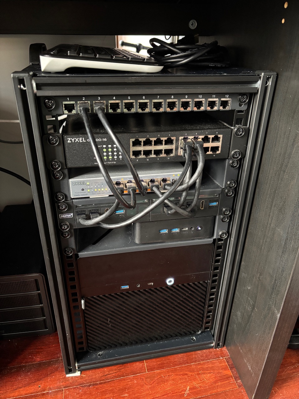 Updates on the server.Added a shelf on the bottom for the NAS (it was sitting inside the rack but on the floor previously) and reorganised everything. Now everything is modular and each shelf has a device and its own power supply, so now I can just unscrew the shelf and take everything out if I need to do anything to that specific device. Also added a top shelf to store the keyboard and cables (and if you squint really hard you can see I cut the sides all wrong so the shelf is slightly smaller than the rack itself kek).Now I need MOAR disks and maybe an ARM or x86 SBC for running a gaming server so I can locally store all my retro saved games from all devices in one spot and also stream retro games (the succubus would be delighted by that).Oh and I also need to label the Ethernet ports.