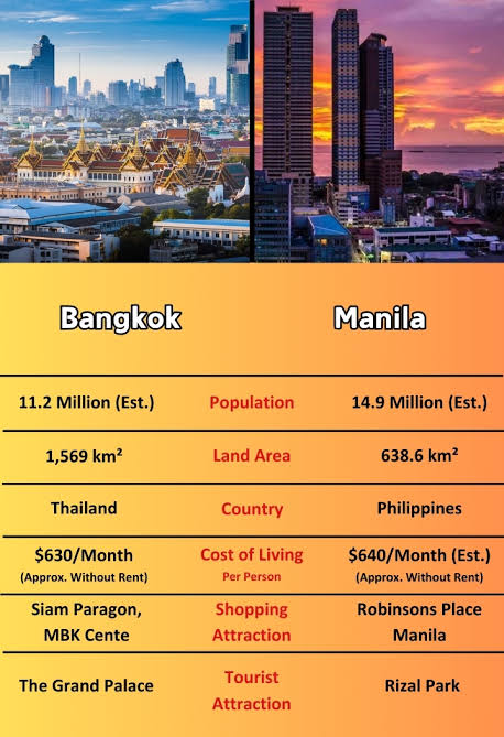 Manila>Legit third world>Urban planning is horrendous. Nothing works. Even the elevator broke down and I was stuck for like 10 min.>not many foreigners or tourists. But a lot of Americans for some reason.>Wealth disparity is insane. Literal post apocalyptic slums not far for central districts.>beggar kids nagging you everywhere you go>Not much to see since all the Spanish legacy was blown up in WW2. The only real attraction is maybe the mega malls.Bangkok>More like second world>The city is legit huge, filled with skyscrapers and construction. (Hard to believe manila has more people)>Feels definitely safer. Not first world, transport is always late, but not broken like in Manila. Has subways and sky trains. >Poor areas exist but not even comparable to Philippines. Worst is maybe you'll see someone begging on those sky bridges. >A lot more to see and do. Party districts for backpackers. Red light districts for sexpats. Ancient temples for tourists. Traditional massage etc if you want to just chill.