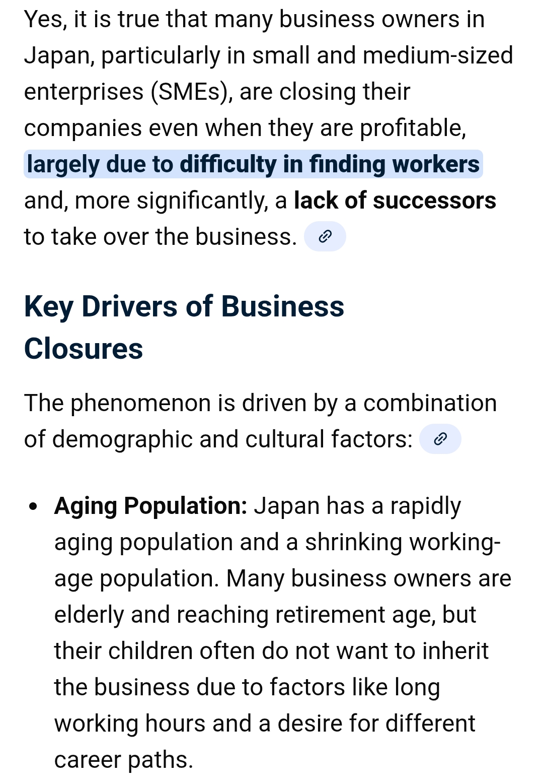 >>218237624You haven't grasped the crux of this argument.I stated that Japan is in a situation where companies must close even when operating at a profit due to labour shortages. This situation is unthinkable in Germany. Closing companies because of severe labour shortages?Germany continuously welcomes immigrants, so closing companies due to labour shortages simply doesn't happen there.