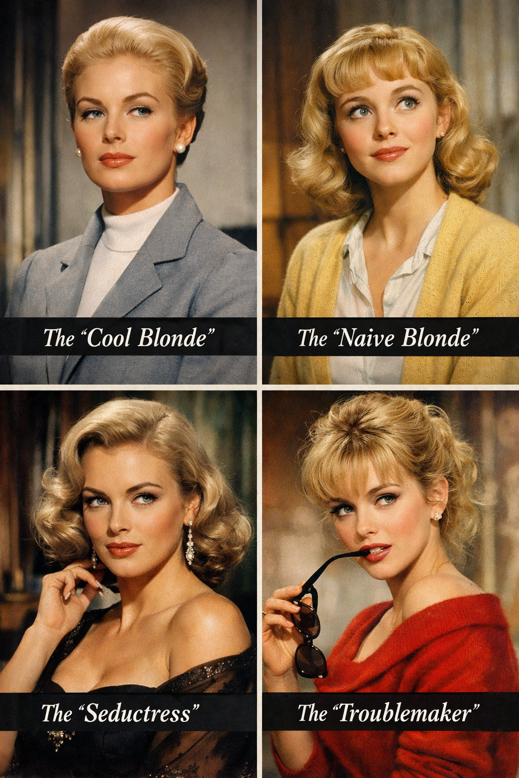i have a theory hear me out, i am pretty sure you know about hitchcocks love of blondes, but did you know he had 4 blonde types? yep a whole blonde as personality types, it was his ultimate theory actually overtly hidden in plain sight, also contributed to the blonde mania until to day