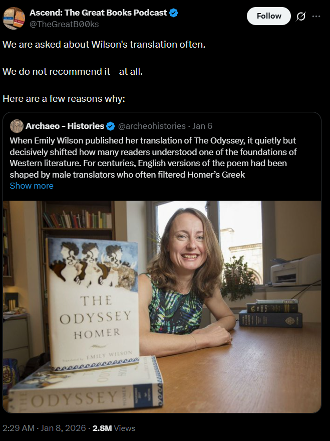 >Wilson's tends to be flat and banal - and intentionally so...POP >"The inconsistencies in Wilson’s forced characterizations create cognitive dissonance."POP POP>"But Wilson’s version saps the marrow and vigor from the words."SKADOOSH>"Wilson’s Iliad is so deflated that it’s hard to tell what Homer’s characters are fighting for."KILLSHOT