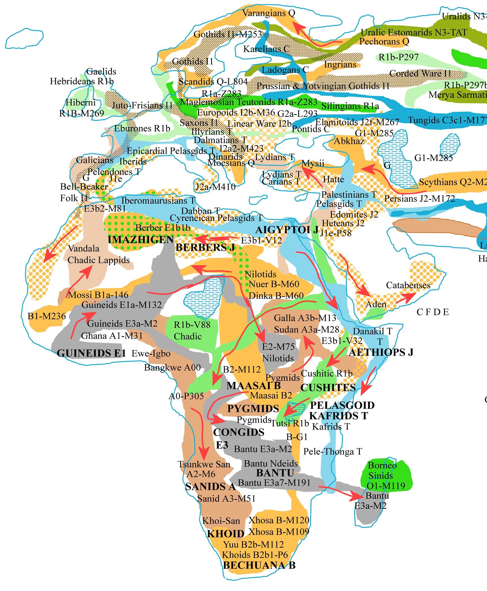 >>218353424Lol no they're autosomally the same, they might have y-dna differences due to multiple bottlenecks but that's just the mutations because the original branches and most common ones are E A B and R in some placesPicrel is an amateur map but it's the best i found, point being that whatever you read might be correct in the context of y-dna mutations but otherwise negros are one big cluster for the most part aside from khoisan or masai or dinka
