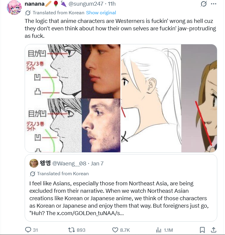 This is literally posted by a Korean feminist btw, both sides of the argument are retarded, most anime characters don't look like any race.