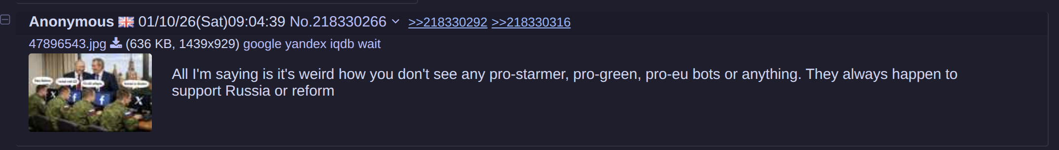 Mental how in the previous thread I made 1 (one) post about russian bots then suddenly there were 5 or 6 counter posts