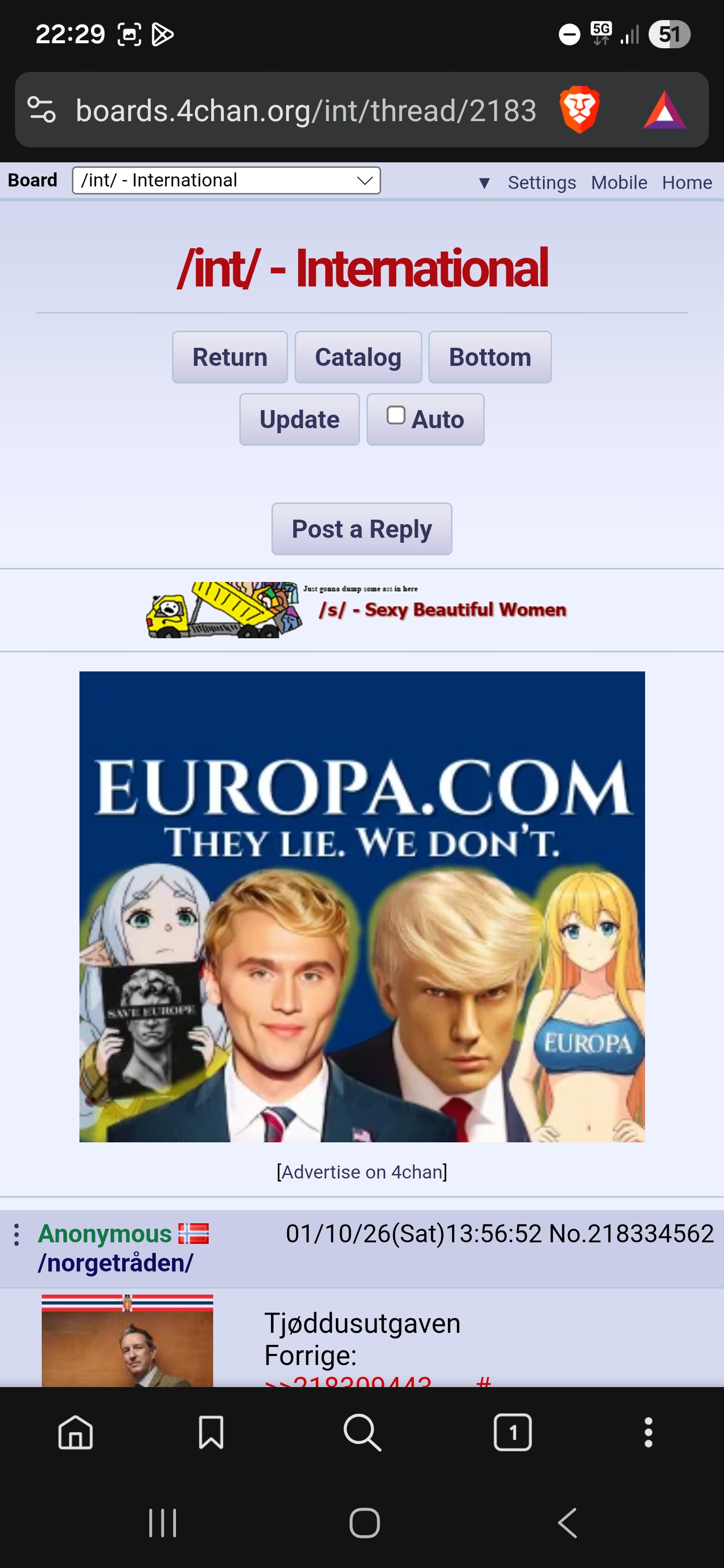 Jo mere jeg blir radikalisert av kanalen og eks, desto mere koko virker dagens norge. Det at folk våger å være åpent homofile er som å kunngjøre at du elsker bæsjsex og har hundre kjønnssykdommer. Det at jenter bare mister møydommen sin til noen på fest og later som de ikke vanærer familien og faren sin. Det at folk får permanente krusseduller som forårsaker hudkreft på seg. Det at folk ikke ønsker barn og velger å ha en hund i senga i stedet for en ektemann/kone. At folk bor sammen med folk av det motsatte kjønn de ikke er gift med. At menn og kvinner går på frisør av motsatt kjønn. 99% av samfunn på tvers av historien og kloden hadde vemmet seg. For ikke å snakke om masseerstatningen av tjoden