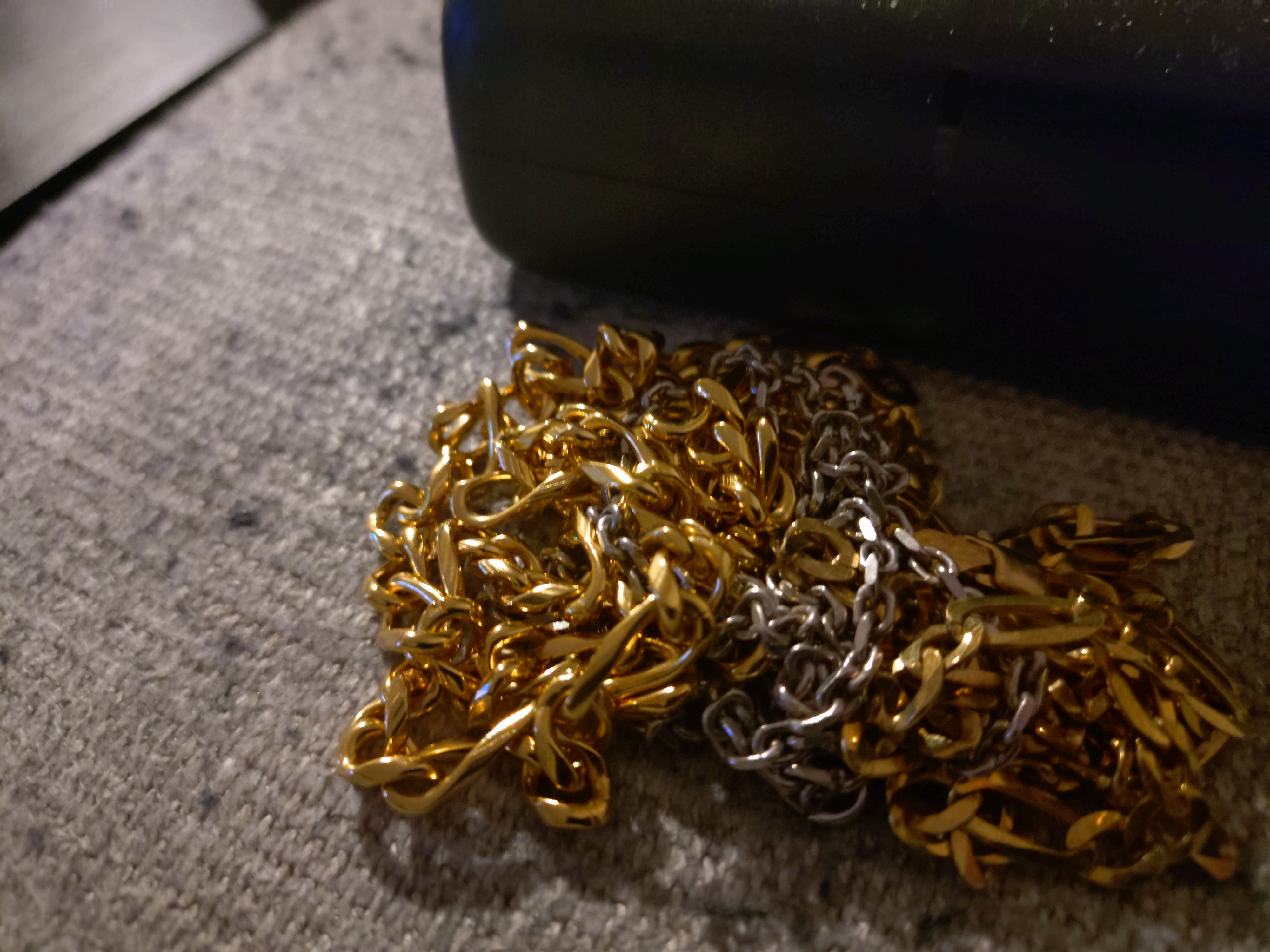 Jeg fant noen gamle falske gullkjeder jeg har kjøpt for 20 år siden, lurer på om det er noe sølv i dem. Tror jeg skal sende dem inn til K.A. Rasmussen og selge dem hvis de finner noen verdi i dem.