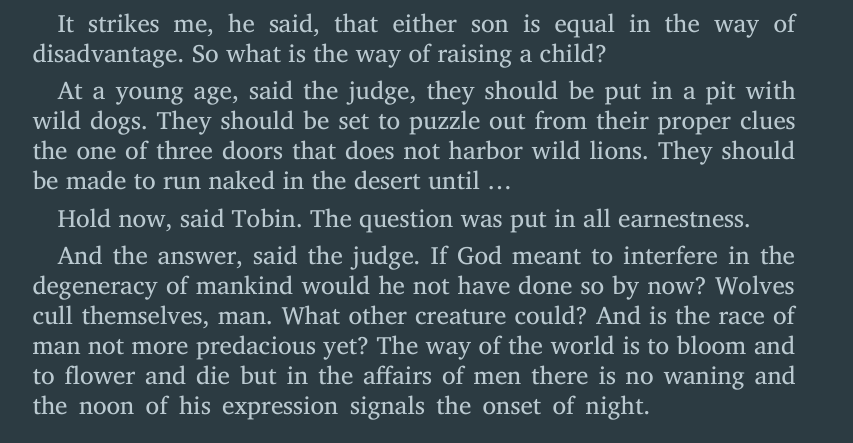>>218344334It makes no difference what men think of war. War endures. As well ask men what they think of stone. War was always here. Before man was, war waited for him. The ultimate trade awaiting its ultimate practitioner. That is the way it was and will be. That way and not some other way.