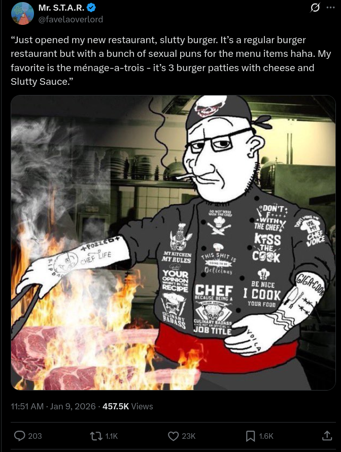 Just opened my new restaurant, slutty burger. It’s a regular burger restaurant but with a bunch of sexual puns for the menu items haha. My favorite is the ménage-a-trois - it’s 3 burger patties with cheese and Slutty Sauce.