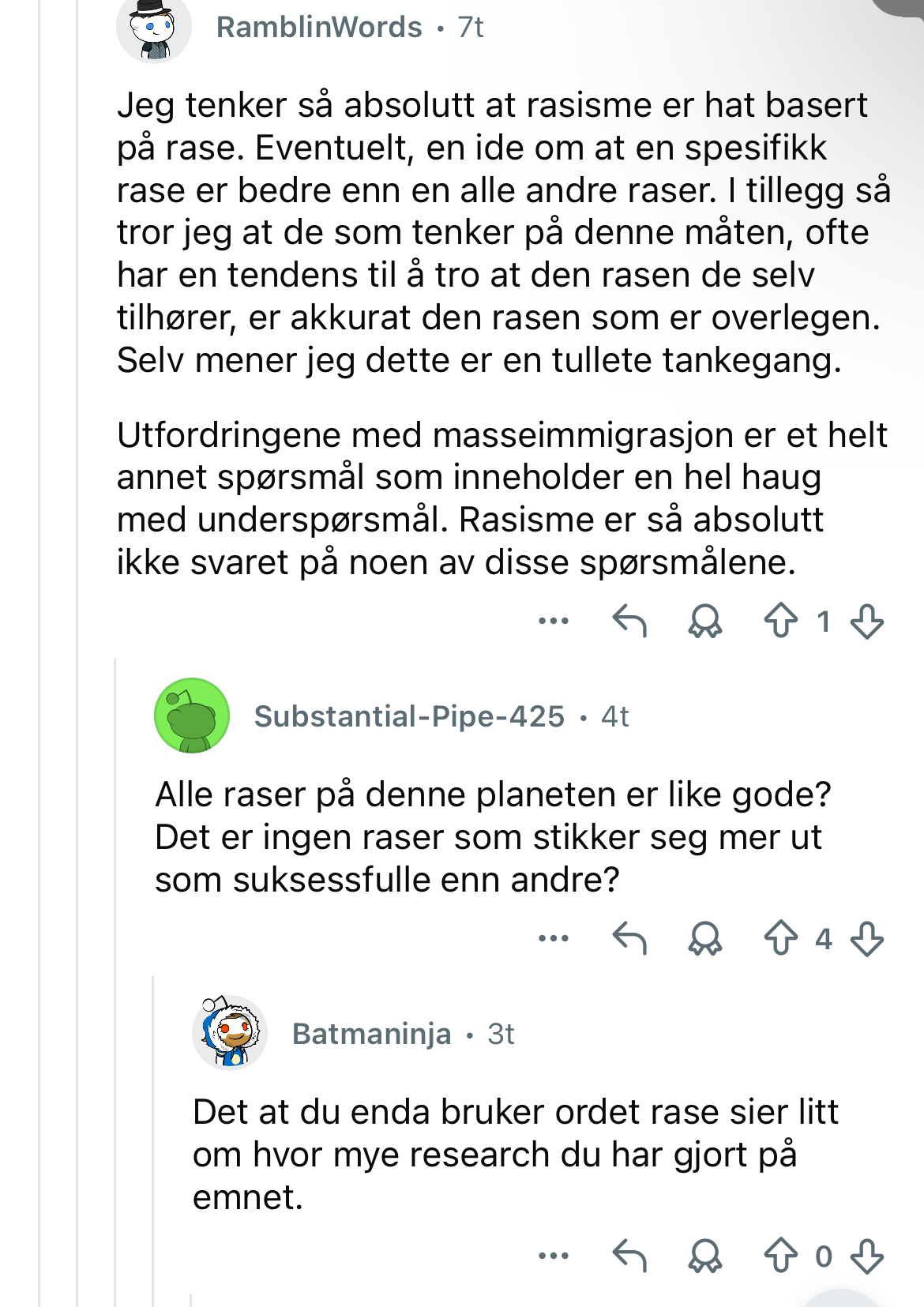 Kanskje jeg burde dratt til Lestdet, og brevet de mest munnpustende mongobrevene der, og blitt toppbrever. For det er ikke ekte personer som tenker slik som i >>218360696, er det vel?