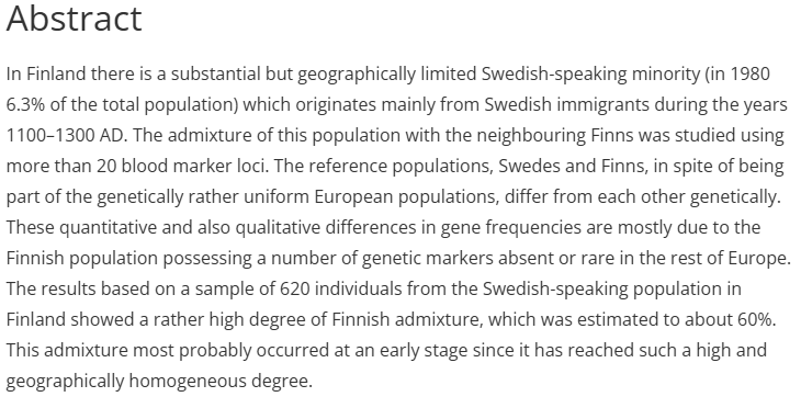 >>218371296Nah, they are pretty much just a blend of Finns and Swedes(Saarhunter for example is a 50-50 mutt) although it's complex because of recent intermarriage which makes them more Finnish every year(in a genetic sense). Basically the way works here is, intermarriage is extremely common among Finnish and Swedish speakers(so there are more mixed language kids than full-Swedish speaking ones) and the offspring are 90% of the time registered as Swedish for the lifetime benefits. You can become a doctor or a lawyer or any other such career more easily as a Swedish speaker since there's 20% quotas for them in universities while their % is a fraction of that, so they automatically get in without doing all the hard work. You'd have to be an idiot to sign up your mixed language kid as a Finnish speaker.