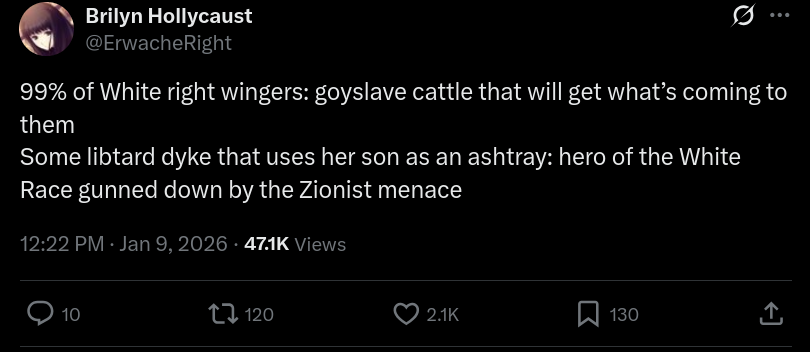 >>218380842Rightoids fell for the "Karen" psyop and hate White women. The shooter was a literal racial jew, but the Christcuck rightoids think he's just a Christian.This country is cooked.
