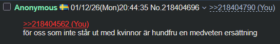 >>218404562för oss som inte står ut med kvinnor är hundfru en medveten ersättning