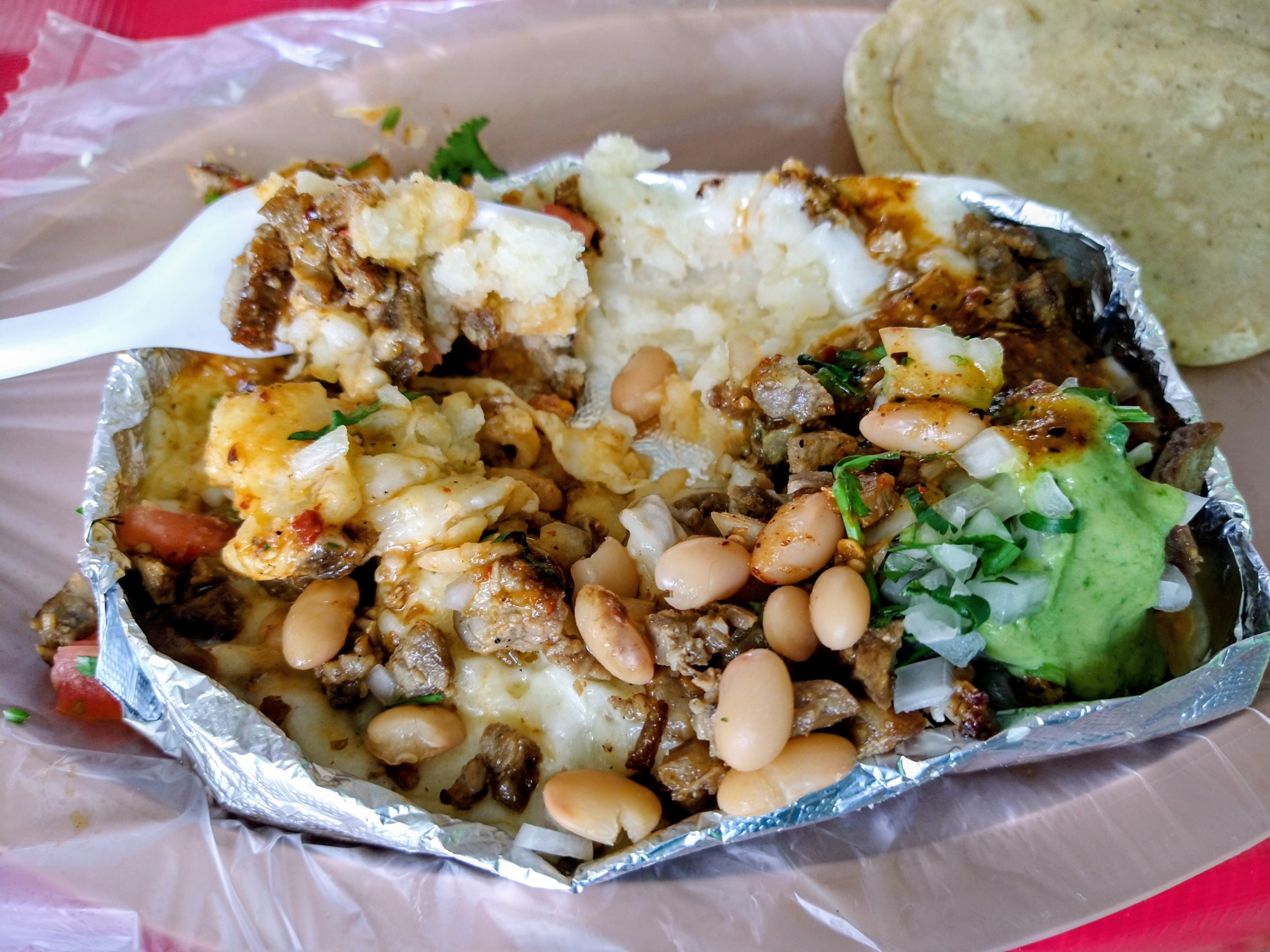 Papas gratinadas It's baked potato mashed down on the bottom a white cheese, and then all the toppings with meat and then they bring it to you and you add more toppings. You can eat it with a fork or make little tacos.