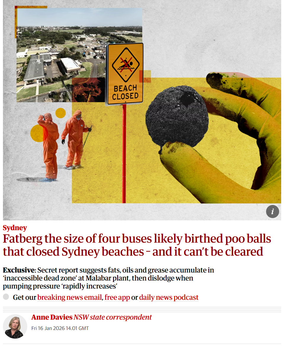 Sydney Water’s deepwater ocean outfalls (DOOF) assessment report's states a giant fatberg the size of four Sydney buses is the source of the poo balls that washed up on Sydney beaches a year ago.Fixing the problem would require shutting down the outfall, which would close Sydney’s beaches “for months”. This has “never been done” and is “no longer considered an acceptable approach”, the report acknowledges.