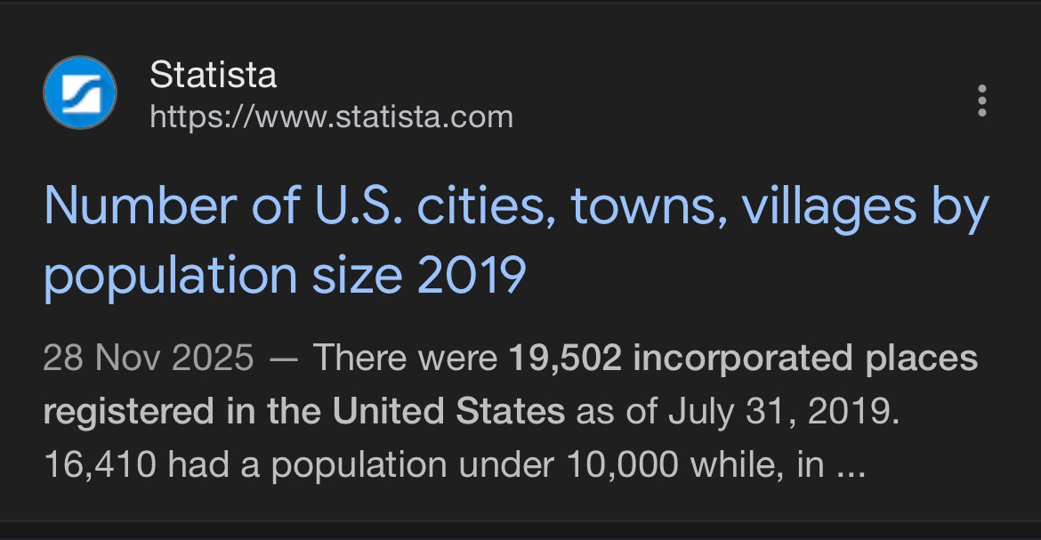 Towns and villages in the UK - over 40,000Towns and villages in USA - 19,000 - 19,500What the fuck