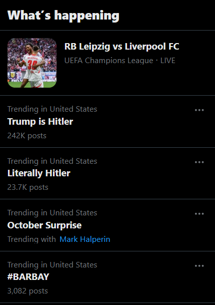 >>218600855I didn't say I took that screenshot today, but I like taking them from time to time to post them in these threads that claim twitter is a right wing echo chamber now, when in fact pretty much every time republicans fuck up (which is almost every day) it becomes a top trend on twitter from all the people ridiculing them. Hell the only reason they're not on your screenshot is because twitter trends have a hard coded limited time on the top list even if people keep talking about them.