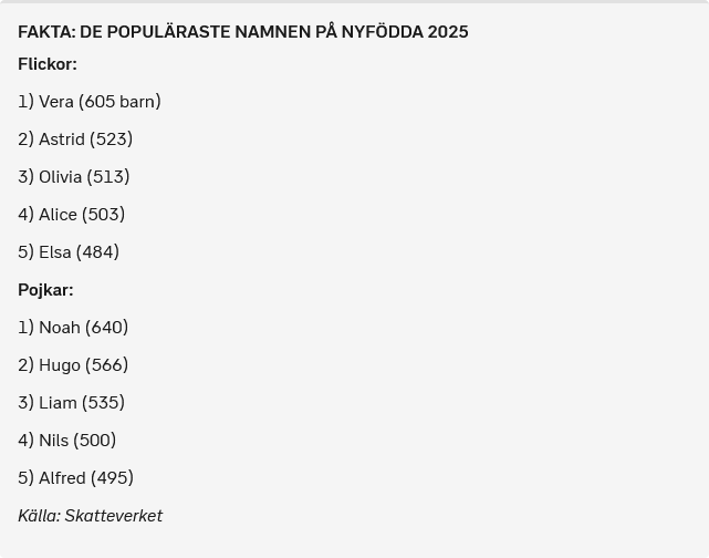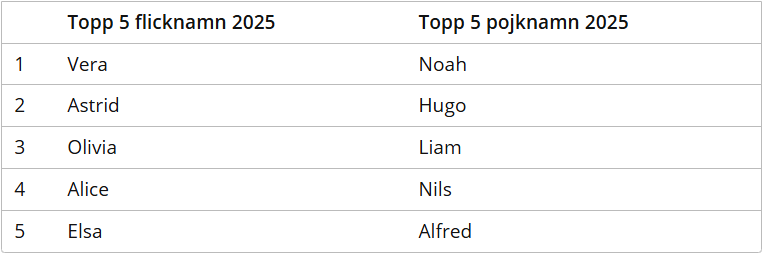 Fakta: De populäraste namnen på nyfödda 2025Flickor:1) Vera (605 barn)2) Astrid (523)3) Olivia (513)4) Alice (503)5) Elsa (484)Pojkar:1) Noah (640)2) Hugo (566)3) Liam (535)4) Nils (500)5) Alfred (495)Nils, Alfred, Hugo. Rätt trad eller?