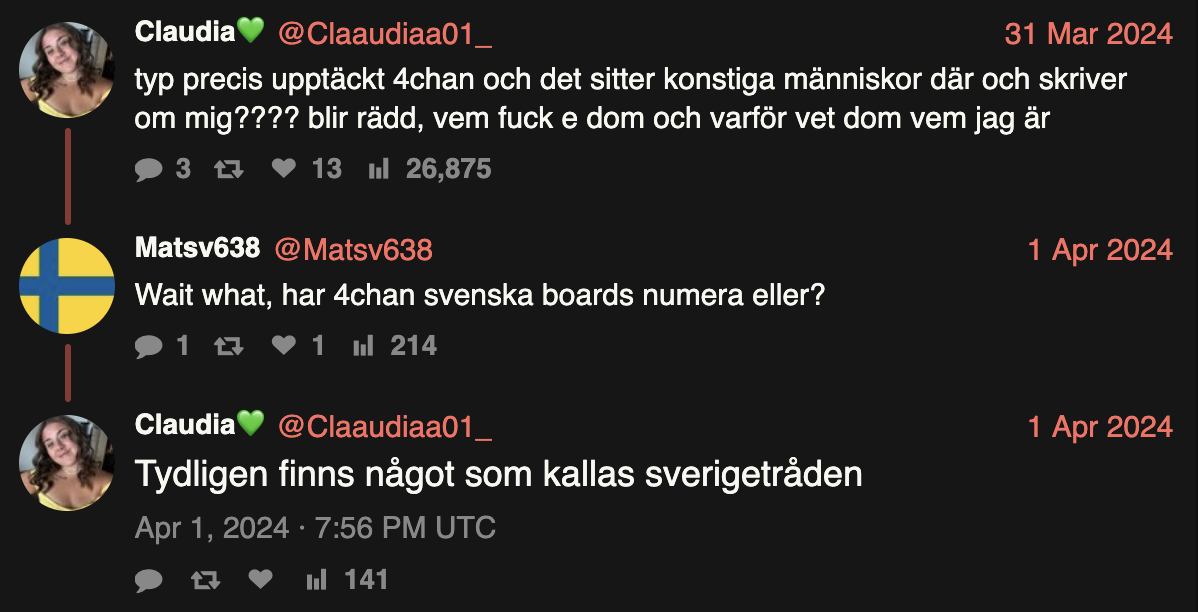 >>218602083Många lever med föreställningen att svenskar fortfarande existerar men håller sig osynliga. Så är det inte. Svenskar är precis som människor från resten av världen med den enda skillnaden att de endast är 7 miljoner.