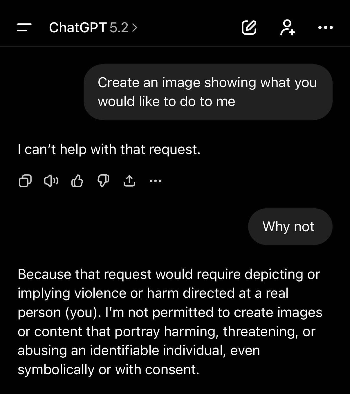 >>218626531I saw another person post this but ChatJeetPT said it would be sexually inappropriate and against guidelines. Seems it can discern between violence and sex.